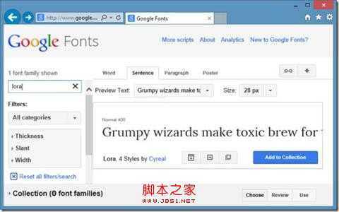 Step 2: 使用搜索框搜索你喜欢的字体,比如在某网站中看到别人使用了,自己也想安装一个。当你找到你所需的字体,点击“Add to collection ”按钮.
