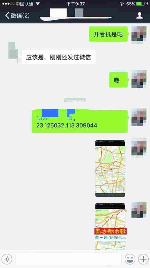 最后,南都记者决定再换个同事的手机号码,查一下其手机定位情况,前述工作人员表示仅可查询联通号码的手机定位,查询时间为半小时,收费是 600元。南都记者提供手机号码并付款半个多小时之后,对方发来了定位信息的图片,内含地图、经纬度信息(精确到小数点后六位),与记者同事所在的位置完 全一致。