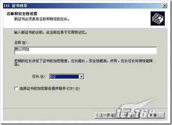 第七步:设置证书的名称和特定位长,名称保持默认网站即可,在位长处我们通过下拉菜单选择512。