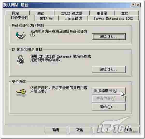 第三步:在默认网站属性窗口中点“目录安全性”标签,然后在安全通信处点“服务器证书”按钮。